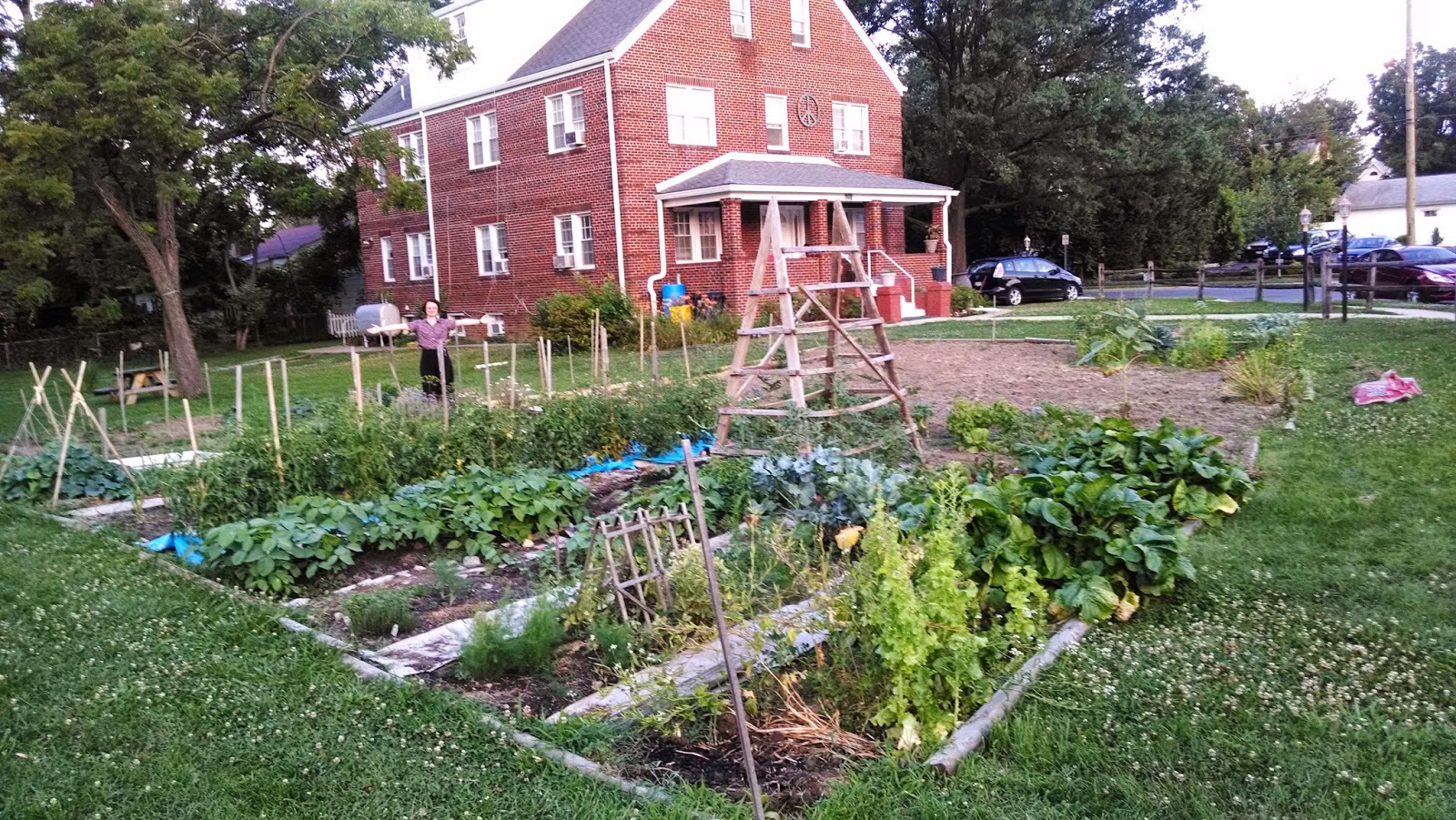 This is the garden at the end of June. I'm there in the back, marking the end of my plot. It's great having so much space, although when it comes to watering I occasionally wish for a smaller garden. I've calculated that each week without rain means I need to carry 300 gallons from the rain barrels to my garden. Who needs a gym with these kinds of chores?